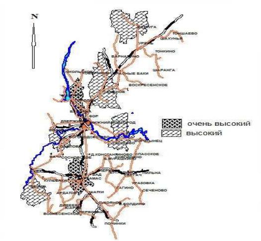 численных данных. В результате получили практически зеркальный рисунок распределения этих ресурсных центров на северной и южной половинах территории Нижегородской области относительно контрастной зоны (по рельефу и ландшафтному строению), которая проходит по руслу реки Волга (или от областного центра).