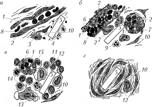 Рис. 14.4. Схема последовательных фаз асептического воспаления [ 571: а — стадия альтерации; 6 — стадия экссудации и лейкоцитарная; в — стадия экссудации и макрофагическая; г — стадия пролиферации (фибробластиче- ская); 1 — капилляр; 2 — базальная мембрана; 3 — разрушенная тучная клетка; 4 — кариорексис; 5 — инородное тело; 6 — набухшие эндотелиоциты; 7 — диапедез нейтрофильпых гранулоцитов; 8 — эритроцит; 9 — гибнущий ней- трофильпый гранулоцит; 10 — фибробласт; 11 — лимфоцит; 12 — моноцит;