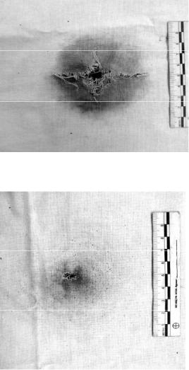 Некоторые специалисты указывают на «дефект ткани» как на один из кардинальных признаков, отличающих входное пулевое отверстие от выходного1. Однако не всегда можно наблюдать«дефект ткани». Например, в легко растяжимых тканях(резина) либо тканях текстильных материалов редкого переплетения нитей (мешковина) отличить входное отверстие от выходного и вообще обнаружить их представляется затруднительным. Степень выраженности «дефекта ткани» в области входного отверстия зависит, в частности, и от формы пули. При поражениях остроконечной пулей или пулей с тупым носиком дефект будет больше, чем пулей с закругленным носиком.