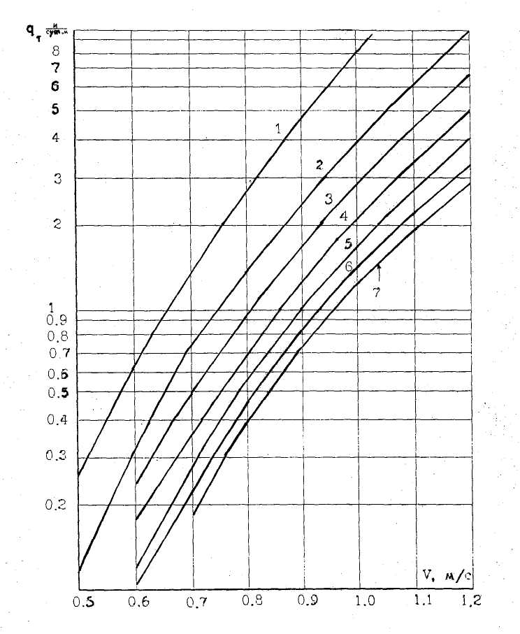 На русловых участках со средними скоростями течения на вертикалях меньше 0,5 м/с заносимость траншей не учитывается. При больших скоростях потока учитывается интенсивность перемещения донных отложений qт (м3/сут.м) в зависимости от глубины и скорости потока .