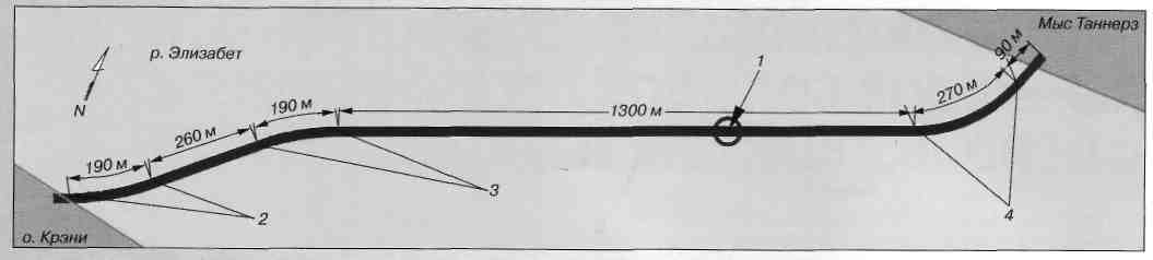 Интересны возможности метода ННБ при прокладке подводной трассы по кривой не только в вертикальном, но и в горизонтальном направлении. Например, при бурении скважины диаметром 304 мм и длиной 2300 м под дном р. Элизабет при максимальном заглубление 27,4 м у мыса Таннерз (штат Виргиния США) трасса имела в плане 3 кривых участка (см. рис. 15.5). Следует отметить, что работы осуществлялись фирмой UTEC Construction методом горизонтального наклонного бурения с разных берегов реки двумя самостоятельными скважинами со стыковкой под дном реки. При их проходки и соединении использовались системы наведения Paratrack II. При сближении двух буровых инструментов и их точного наведения один из них (с короткой стороны) стал вытягиваться назад, а головная часть другого была направлена в след удаляемому до выхода на противоположный берег. Основные проходческие работы без учета подготовительного этапа, были осуществлёны за 19 суток и прошли весьма успешно.