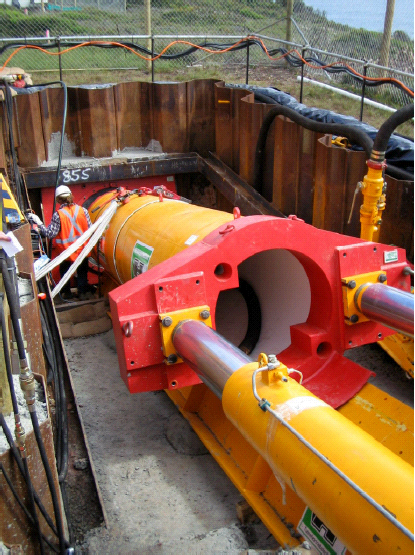 Поступательное движение проходческому щиту передается от рамы продавливания через став труб. Трубы потом остаются в грунте в качестве трубопровода.