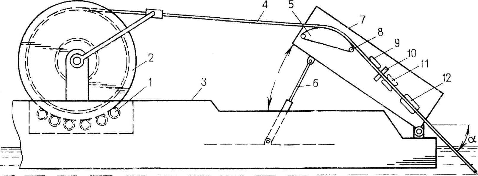 Конструкция трубоукладочной баржи с барабаном, расположенным в вертикальном положении, показана на рис. 15.19. Барабан 2, установленный на трубоукладочной барже 3, приводится во вращение электродвигателями 1. При вращении барабана по часовой стрелке разматываемый трубопровод 4 проходит через направляющее устройство 7, в верхней части которого расположен шаблон 5, изменяющий угол наклона погружаемого трубопровода. Регулирование угла наклона осуществляется поворотом направляющего устройства 7 с помощью тяги 6. Витки трубопровода, намотанные на барабан, имеют различный радиус, что обусловливает неодинаковую остаточную кривизну трубопровода при сходе с шаблона 5 в точке 8. Для устранения остаточной кривизны трубопровод пропускается через корректирующие башмаки 9, 10 и 11. Напряжение на вогнутом участке укладываемого трубопровода регулируется с помощью натяжного устройства 12.