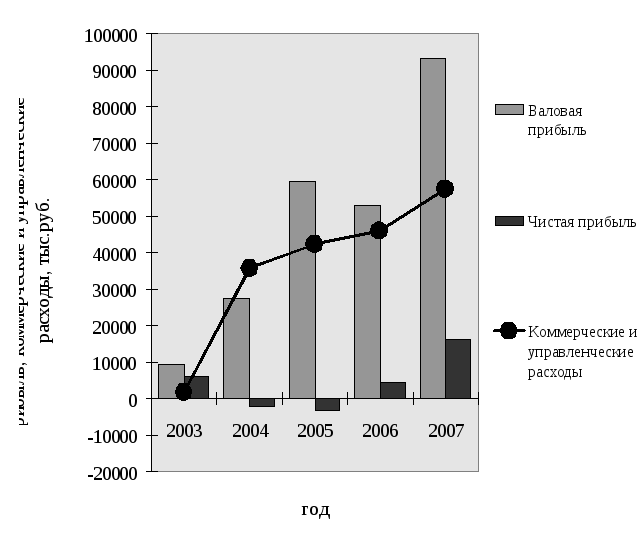 Как видно из рисунка, прослеживается тенденция увеличения расходов на продажу. Причем с 2004 года наблюдался резкий скачок повышения коммерческих и управленческих расходов – с 1787 тыс. руб. до 35663 тыс. руб., что стало причиной появления убытка. 2005 год также был убыточным. Однако при этом размер валовой прибыли увеличился в 2,2 раза. В 2006 году произошло незначительное снижение валовой прибыли до 52807 тыс. руб., но была получена чистая прибыль в размере 4200 тыс. руб.