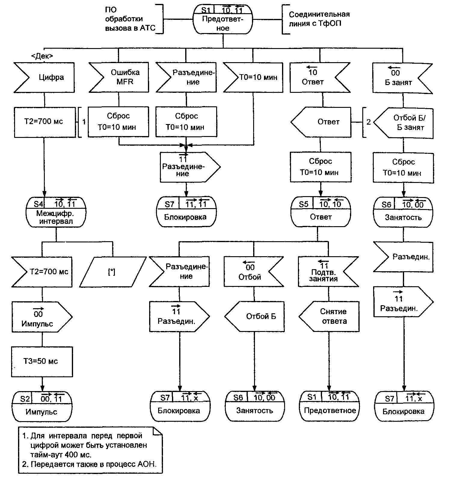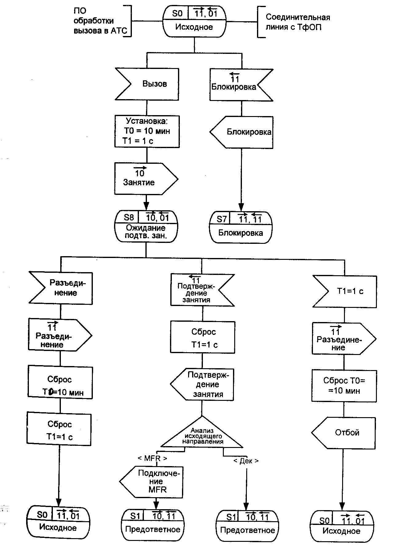 В предответное состоянии возможно появление сообщений от программного обеспечения исходящей АТС, связанных либо с ошибкой MFR, либо с разъединением, либо со срабатыванием тайм-аута ограничения непродуктивного занятия канала. Во всех трех случаях направляется сигнал «Разъединение» (11), после чего осуществляется переход в состояние блокировки, в каждом случае обозначающее ожидание сигнала «Контроль исходного состояния». В этом же предответном состоянии возможно также появление сигнала «Занятость абонента Б» (00), после чего осуществляется переход в состояние занятости S6 с соответствующей посылкой сигнала «Разъединение» (11) в сторону исходящей АТС и переход в вышеупомянутое состояние ожидания контроля исходного состояния.