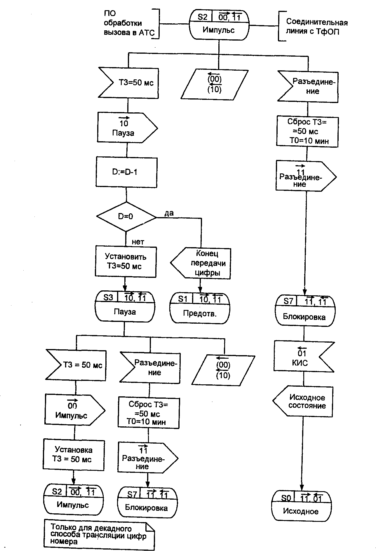 В первом случае направляется сообщение в ПО о подключении соответствующего многочастотного приемопередатчика MFR, и осуществляется переход в предответное состояние S 1. В случае декадного набора переход в предответное состояние происходит непосредственно с последующей передачей импульсов и пауз набора номера вызываемого абонента декадным кодом. При этом в первом случае цифры номера направляются от ПО исходящей АТС в процесс MFS, во втором случае цифры номера поступают в описываемый здесь процесс OTLOC для трансляции импульсов и пауз.
