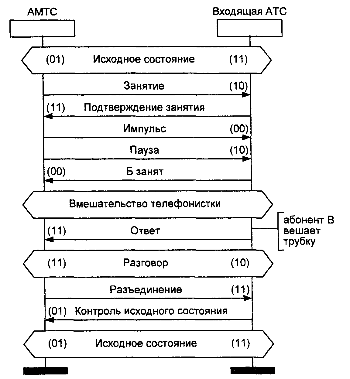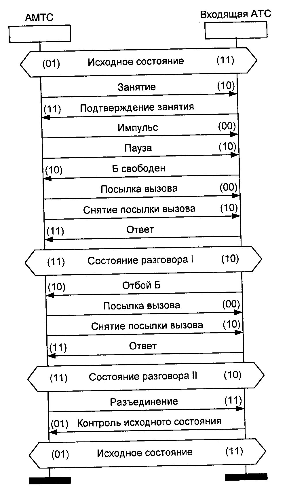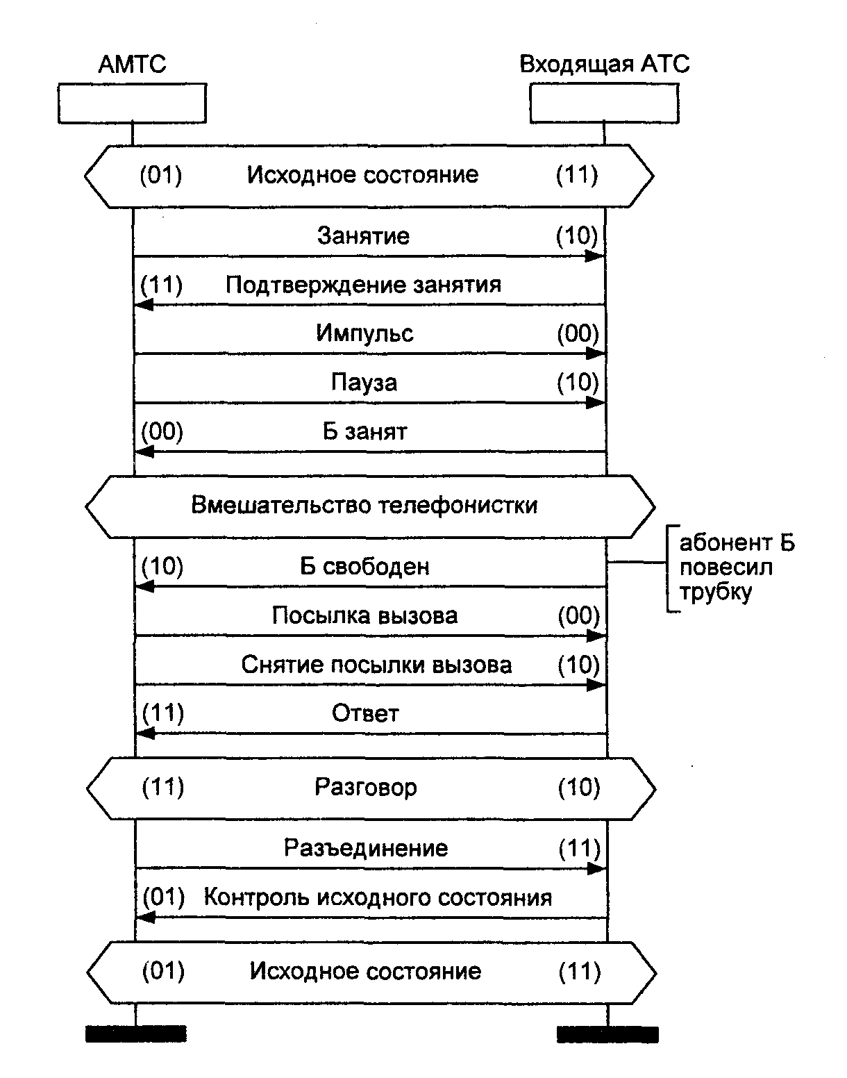 В состоянии ожидания разъединения S6 процесс ожидает только единенный линейный сигнал (11), означающий разъединение, в ответ на который направляется сигнал «Контроль исходного состояния» (01), и система переходит в исходное состояние SO.