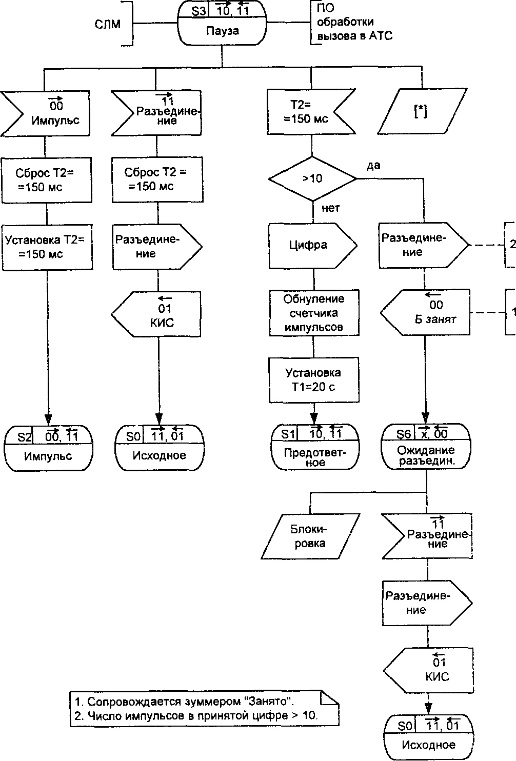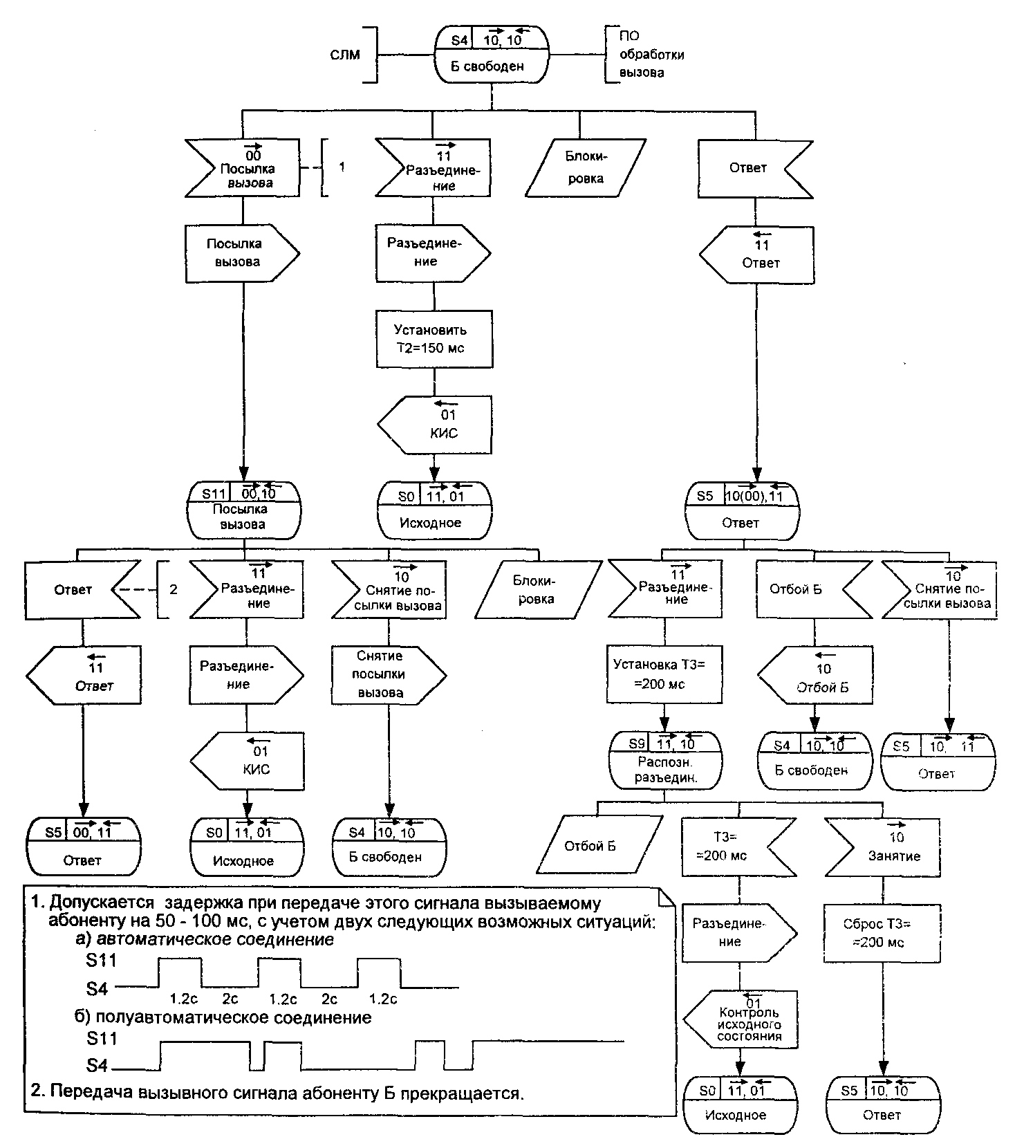 Состояние S10 при автоматическом способе обслуживания вызовов в АМТС предусматривает только прием сигнала «Разъединение» (11), в ответ на который посылается «Контроль исходного состояния» (01) и процесс возвращается в исходное состояние SO. При полуавтоматической связи осуществляется подключение телефонистки к занятому вызываемому абоненту, а дальнейшее развитие процесса зависит от того, кто из двух разговаривающих абонентов первым положил трубку. Последнее иллюстрируется примечанием 2 к состоянию S10 на SDL-диаграмме процесса INTOL.