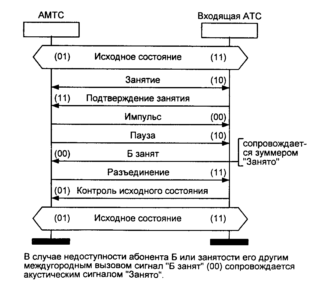 Рис. 3.12. Сценарии обмена сигналами (междугородный вызов) г) абонент Б занят, автоматическая связь