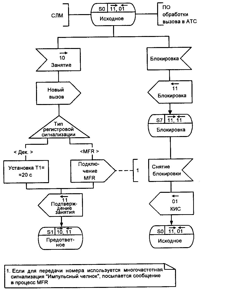 При использовании декадного способа передачи цифр номера устанавливается тайм-аут Т 1, равный 20 с, ограничивающий ожидание первого импульса набора номера, и так же направляется линейный сигнал «Подтверждения занятия» (11). В обоих случаях осуществляется переход в предответное состояние S1.