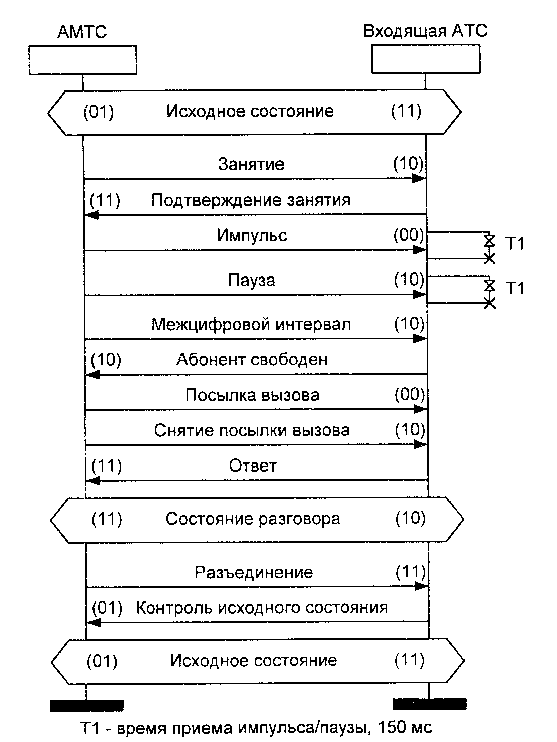 В состоянии распознавания разъединения S9 возможно исчезновение сигнала «Разъединение» до его распознавания, то есть возвращение сигнала «Занятие» (10), в связи с чем сбрасывается тайм-аут ТЗ и система возвращается в разговорное состояние S5. В этот же период также возможно появление сообщения «Отбой Б», которое целесообразно запомнить и обработать лишь при переходе в разговорное состояние. Если изменения не происходят в течение 200 мс, то есть сигнал «Разъединение» (11) считается достоверно распознанным, то в ПО обработки вызова АТС направляется сообщение «Разъединение», в соединительную линию направляется сигнал «Контроль исходного состояния» (01) и система переходит в исходное состояние SO.