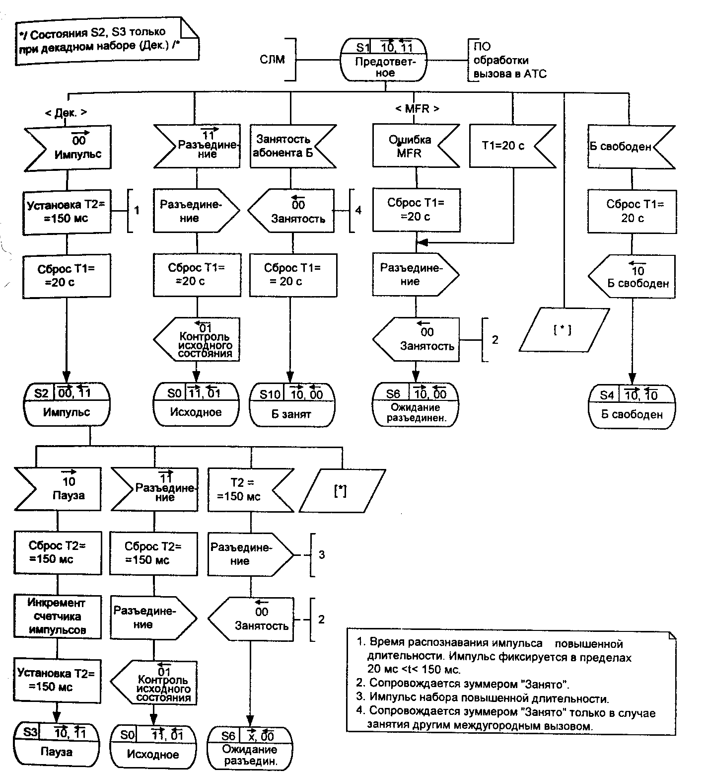 В предответном состоянии возможно появление линейного сигнала «Импульс» (00), в результате которого устанавливается тайм-аут Т2 = 150 мс для анализа наличия импульса повышенной длительности, находящегося за пределами 20-150 мс, а также сбрасывается тайм-аут Т2= 20с. Процесс переходит в состояние импульса S2. При появлении сигнала «Разъединение» (11) направляется сообщение о разъединении в ПО обработки вызова АТС, сбрасывается тайм-аут ожидания цифр набора номера Т 1 == 20 с, в канал направляется сигнал «Контроль исходного состояния» (01) и процесс возвращается в исходное состояние SO.