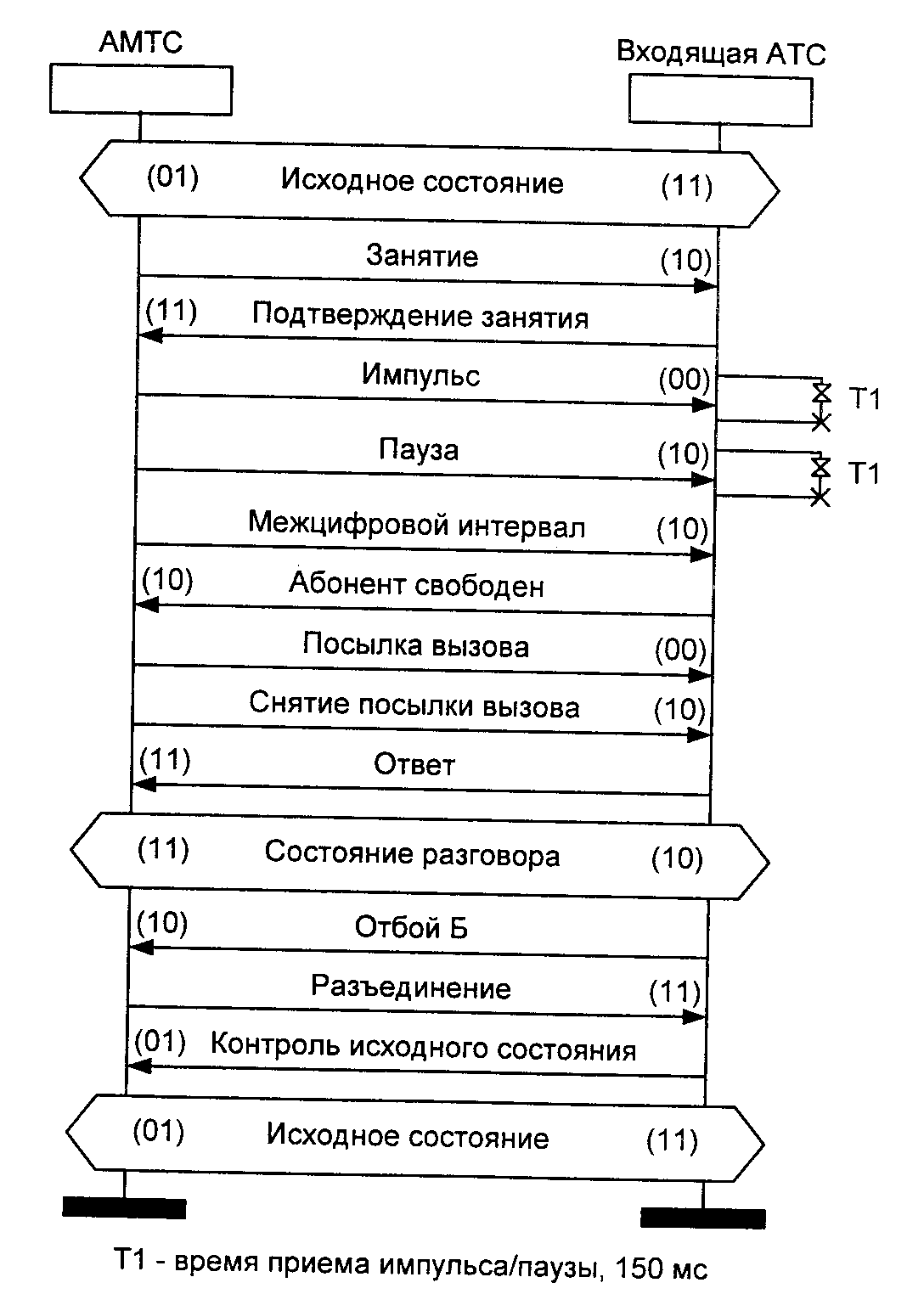 После приема необходимого количества цифр номера возможны две ситуации: вызываемый абонент Б свободен или занят. В первом случае, в отличие от процесса INLOC обработки местного вызова, вызываемому абоненту не посылается немедленно вызывной сигнал, а в соединительную линию к АМТС направляется линейный сигнал «Абонент свободен» (10) и сбрасывается тайм-аут Т1=20 с.