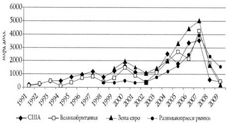. Усилившаяся волатильность на финансовых рынках. При снижении темпов роста общего уровня цен и расхождениях относительных цен отдельных товаров возросла волатильность на финансовых рынках, на которых стали образовываться «пузыри». Среди подобных «пузырей» эпохи глобализации можно выделить рост цен на недвижимость и на фондовом рынке в странах Юго-Восточной Азии в первой половине 1990-х годов; бум на фондовом рынке США, вызванный ростом цен акций компаний «новой экономики» (вторая половина 1990-х годов); рост цен на недвижимость в США и в ряде других развитых стран и стран с формирующимися рынками в середине 2000-х годов. Во всех этих случаях значительную роль в «надувании пузыря» играл приток иностранного капитала. Если проследить динамику совокупных трансграничных потоков капитала (см. рис. 1), то можно сделать вывод о «надувании глобального пузыря» на мировых финансовых рынках в 2006-2007 гг. «Пузыри» практически всегда лопаются, причем со значительными негативными последствиями для национальных экономик. Таким образом, глобальный экономический и финансовый кризис 2007-2009 гг. можно рассматривать как следствие лопнувшего «глобального пузыря». При этом, как показывают посткризисные тенденции развития, «пузыри» на мировом финансовом рынке сохраняются.