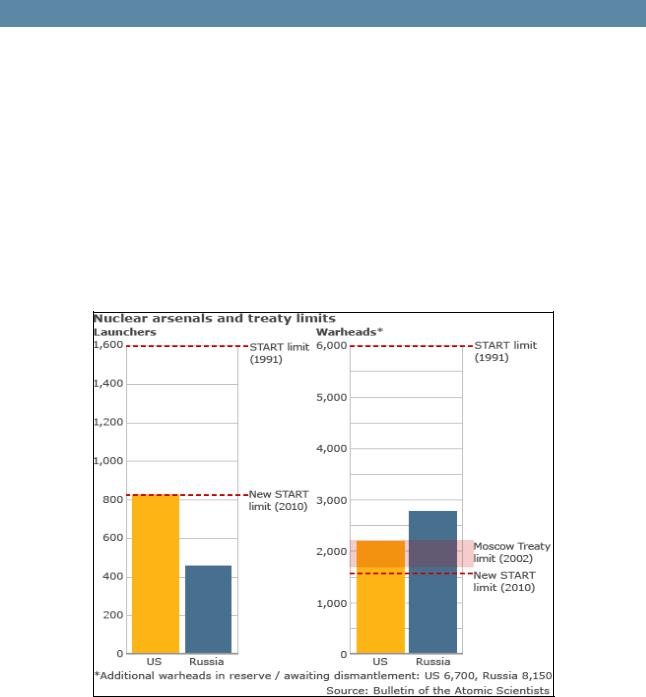 Warheads: 1,550 (74 % lower than the 1991 Start Treaty and 30 % lower than the figure of 2,200 that each side was meant to reach by 2012 under the 2002 Strategic Offensive Reductions Treaty (Sort)).