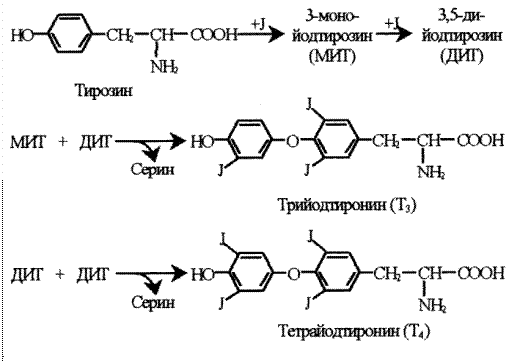 В целом тиреоидные гормоны синтезируются из тирозина и 3, либо 4 молекул I в две стадии: