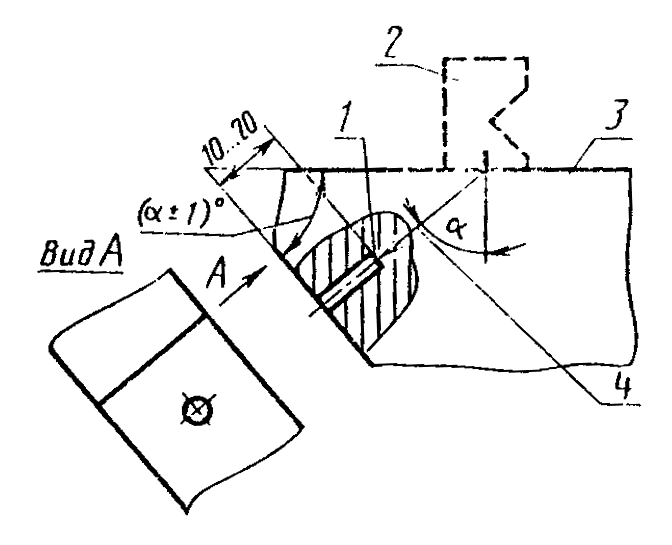 Угол между плоскостью дна 1 отверстия или плоскостью 1 сегмента и контактной поверхностью образца должен составлять (a ± 1)° (см. черт. 5 и черт. 6).