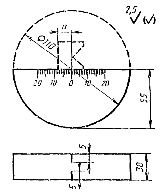 На боковых и рабочей поверхностях образца должны быть выгравированы риски, проходящие через центр полуокружности и по оси рабочей поверхности. В обе стороны от рисок на боковые поверхности наносят шкалы. Нуль шкалы должен совпадать с центром образца с точностью ± 0,1 мм.