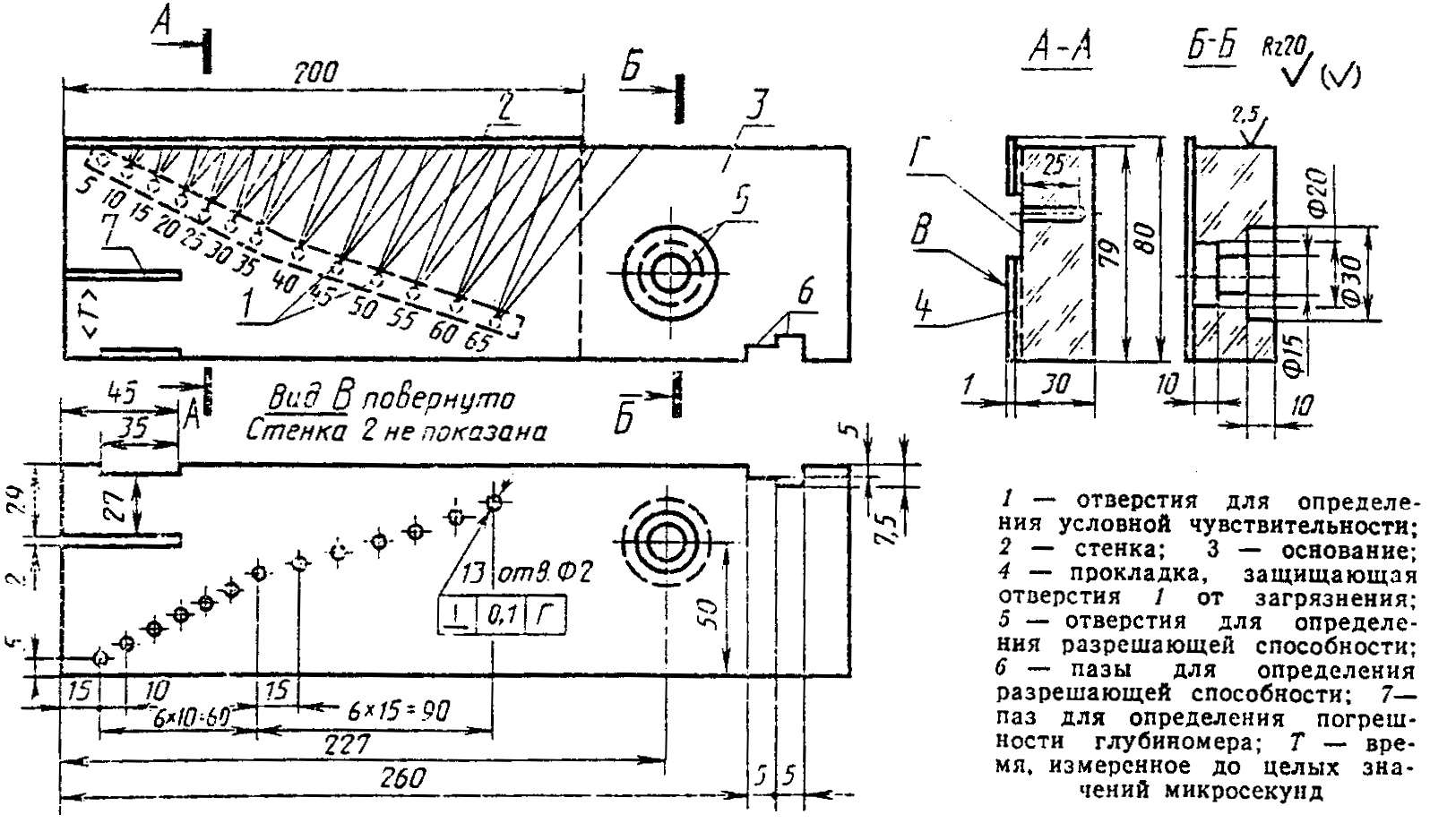 1.4.1. Стандартный образец СО-1 (см. черт. 1) применяют для определения условной чувствительности, проверки разрешающей способности и погрешности глубиномера дефектоскопа.