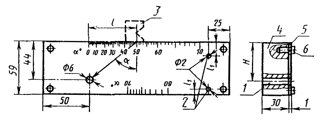 1 - отверстие для определения угла ввода луча, ширины основного лепестка диаграммы направленности, условной и предельной чувствительности; 2 - отверстие для проверки мертвой зоны; 3 - преобразователь; 4 - блок из контролируемого металла; 5 - шкала; 6 - винт.