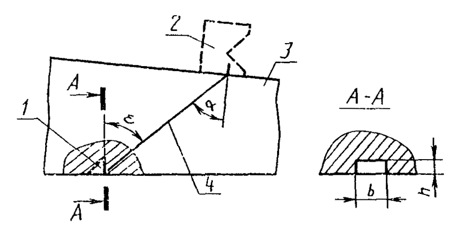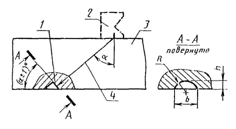 1 - плоскость углового отражателя; 2 - преобразователь; 3 - блок из контролируемого металла; 4 - акустическая ось.