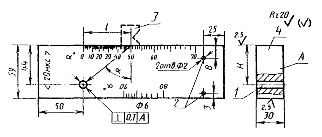 1 - отверстие для определения угла ввода луча, ширины основного лепестка диаграммы направленности, условной и предельной чувствительности; 2 - отверстие для проверки мертвой зоны; 3- преобразователь; 4 - блок из стали марки 20 или стали марки 3.