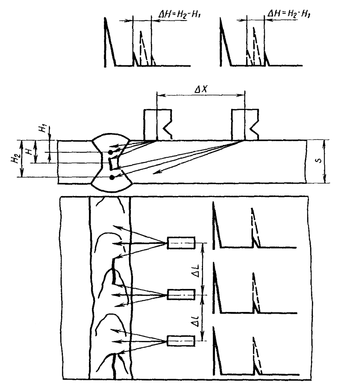 Условную ширину DX и условную высоту DH дефекта измеряют в сечении соединения, где эхо-сигнал от дефекта имеет наибольшую амплитуду, при одних и тех же крайних положениях преобразователя.