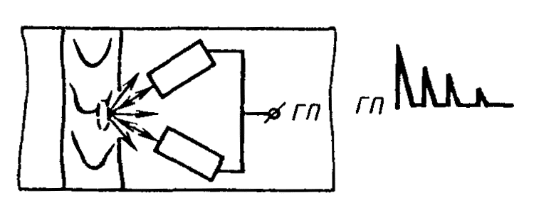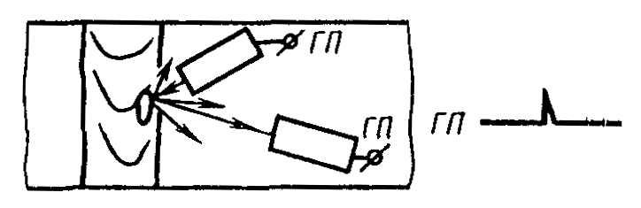 При эхо-импульсном методе применяют совмещенную (черт. 9), раздельную (черт. 10 и 11) и раздельно-совмещенную (черт. 12 и 13) схемы включения преобразователей.