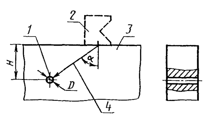 1 - цилиндрическое отверстие; 2 - преобразователь; 3 - блок из контролируемого металла; 4 - акустическая ось.
