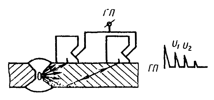 2) сравнение амплитуды эхо-сигнала U1, отраженного от выявленного дефекта обратно к ближнему от шва преобразователю, с амплитудой эхо-сигнала U2, претерпевшего зеркальное отражение от внутренней поверхности соединения и принимаемого двумя преобразователями (см. черт. 12);