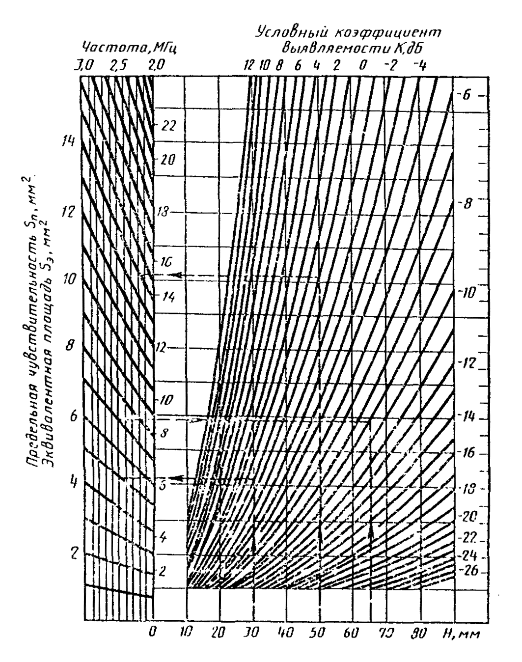 H - глубина, для которой оценивается предельная чувствительность или на которой расположен выявляемый дефект, мм;
