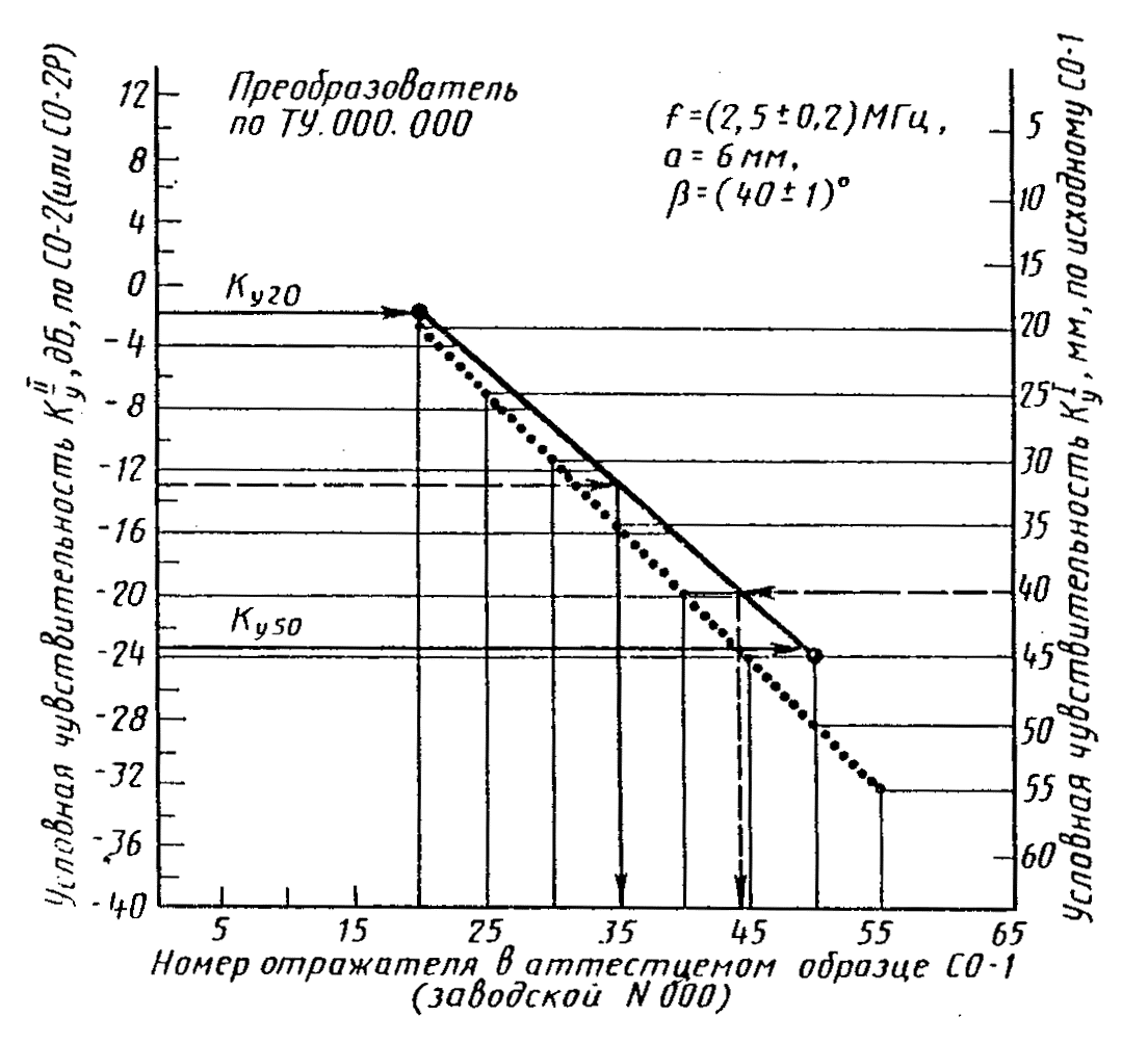 где N0 - показание аттенюатора, соответствующее ослаблению эхо-сигнала от отверстия диаметром 6 мм в образце СО-2 (или СО-2Р) до уровня, при котором оценивают условную чувствительность, дБ;