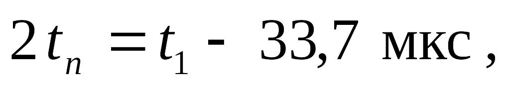 где t1 - суммарное время между зондирующим импульсом и эхо-сигналом от вогнутой цилиндрической поверхности в стандартном образце СО-3 при установке преобразователя в положение, соответствующее максимальной амплитуде эхо-сигнала; 33,7 мкс - время распространения ультразвуковых колебаний в стандартном образце, рассчитанное для параметров: радиус образца - 55 мм, скорость распространения поперечной волны в материале образца - 3,26 мм/мкс.