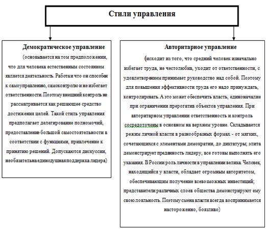 Основополагающим в управлении является определение роли, места человека как объекта управления. По этому критерию различают демократический и авторитарный стили управления.
