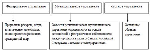 По критериям использования форм собственности и владения имуществом различают федеральное, муниципальное и частное управление (Схема 4. Федеральное, муниципальное и частное управление).