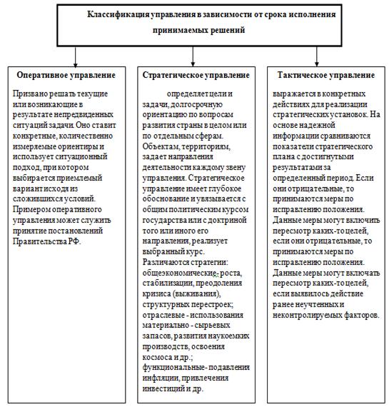 В зависимости от срока исполнения принимаемых решений управление подразделяется: оперативное, тактическое и стратегическое, что отражает схема 6.