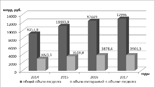 Бюджетная политика на 2015-2017 года не дает конкретных направлений деятельности органов государственной власти в вопросах предоставления госгарантий, но по ее положениям можно отследить возможную динамику объемов государственного долга по госгарантиям и бюджетные ассигнования на их исполнение. Так в 2014 году в составе государственного долга объем государственных гарантий составил 3 021,1 млрд. руб., что является 32,6% от общего объема госдолга за 2014год, за 2015 - 3 619,8 млрд. руб. и 32,3%, за 2016 - 3 878,4 млрд. руб. и 31,2% и прогнозное значение для 2017 года - 3 901,3 и 30%.