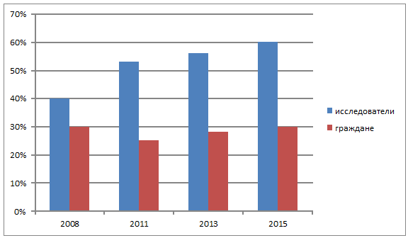 Из диаграммы видно, что исследователи воспринимают процесс финансирования государством бюджетных программ в социальной сфере значительно выше, нежели сами граждане, и можно отметить, что к настоящему моменту, возможно и наблюдается положительная тенденция, но на фоне кризиса это не заметно.