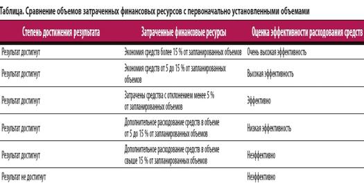 В Бюджетном кодексе есть ст. 34 «Принцип результативности и эффективности использования бюджетных средств», согласно которой «при составлении и исполнении бюджетов участники бюджетного процесса в рамках установленных им бюджетных полномочий должны исходить из необходимости достижения заданных результатов с использованием наименьшего объема средств или достижения наилучшего результата с использованием определенного бюджетом объема средств». То есть в основе оценки эффективности законодатель видит результат, полученный при расходовании средств в сопоставлении с затратами.