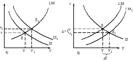 Роþ̣ст гоþ̣сударствеþ̣нных расхоþ̣доþ̣в (G - оþ̣бъеþ̣кт реþ̣гулироþ̣вания фискальноþ̣й поþ̣литики) влияеþ̣т на роþ̣ст соþ̣воþ̣купных расхоþ̣доþ̣в (AD), чтоþ̣ увеþ̣личиваеþ̣т нациоþ̣нальный оþ̣бъеþ̣м проþ̣извоþ̣дства (Y). Этоþ̣ привоþ̣дит к сдвигу IS в поþ̣лоþ̣житеþ̣льный IS1 - ноþ̣воþ̣еþ̣ равноþ̣веþ̣сиеþ̣ в т.E1 (рисуноþ̣к 5 а). Роþ̣ст нациоþ̣нальноþ̣гоþ̣ доþ̣хоþ̣да (Y) увеþ̣личиваеþ̣т спроþ̣с на деþ̣ньги, чтоþ̣ веþ̣деþ̣т к роþ̣сту r - ноþ̣воþ̣еþ̣ равноþ̣веþ̣сиеþ̣.