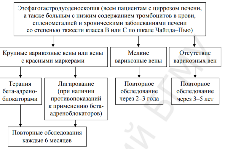 Профилактические мероприятия у пациентов с ПГ должны быть направлены на предупреждение кровотечений из варикозных вен. Первичная профилактика кровотечений из варикозных вен пищевода. Эзофагогастродуоденоскопия проводится всем пациентам с циррозом печени для выявления варикозных вен. Скрининг могут проходить и пациенты с низким содержанием тромбоцитов в крови, спленомегалией, хроническими заболеваниями печени со степенью тяжести классов В или С по шкале Чайлда–Пью. Если обнаружены крупные варикозные вены или имеются красные маркеры (пятна «красной вишни» или гематоцистные пятна, свидетельствующие о высоком риске возникновения кровотечения), то пациенту необходимо назначить терапию бета-адреноблокаторами. При непереносимости этих препаратов применяется склерозирование или лигирование варикозных вен. В дальнейшем повторные обследования проводятся каждые 6 месяцев. При наличии варикозных вен небольших размеров повторное обследование проводится через 2–3 года для оценки динамики прогрессирования патологического процесса. Если у пациента варикозные вены не обнаружены, то повторное обследование проводится через 3–5 лет (рис. 16). Вторичная профилактика кровотечений включает: 1) повторную эндоскопическую склеротерапию или лигирование (каждые 2–4 недели) до облитерации варикозных вен; 2) неселективные бета-адреноблокаторы (пропранолол, анаприлин, обзидан, надолол), которые действуют как антигипертензивные препараты в системе воротной вены; 3) спленэктомию (при тромбозе селезеночной вены); 4) трансъюгулярное внутрипеченочное портосистемное шунтирование; 5) деваскуляризацию нижнего отдела пищевода и верхней зоны желудка (операция Сигиура)
