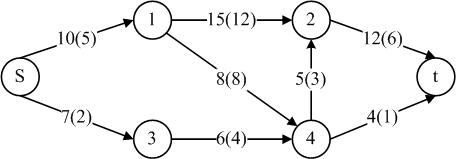 Над каждой дугой указана ее пропускная способность, в скобках - поток по этой дуге.