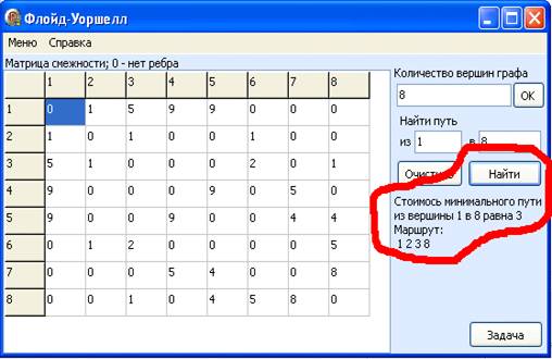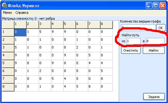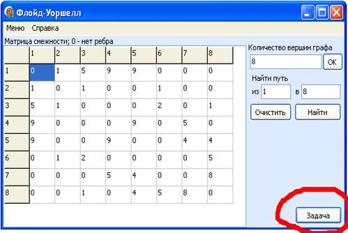 Запустив приложение Floid.exe, откроется окно позволяющее решать задачи методом алгоритма Флойда-Уоршелла