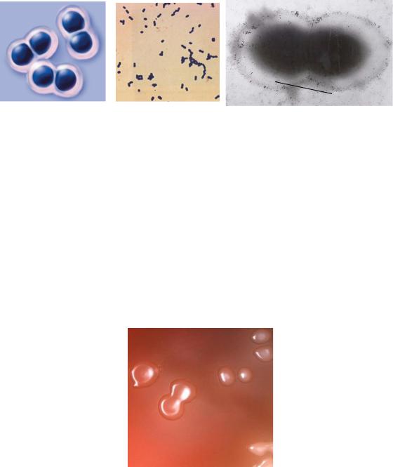 Рисунок 75 – Схематическое изображение (а), окраска по Граму (б) и электронная фотография пневмококка (в).