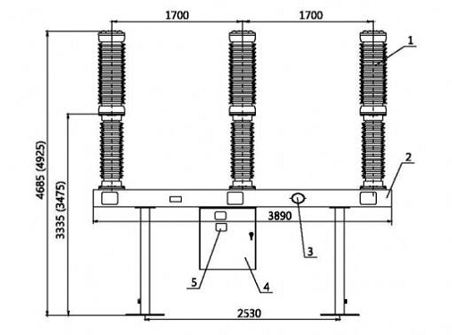 Конфигурация выключателя показана на рис.1. Три фарфоровых полюса установлены на общей раме (базе/основании). Шкаф управления привода расположен под центром основания. Пружинный рабочий механизм и контрольная панель установлены в шкафу управления, выходной полюс механизма соединен с управляющим рычагом центральной фазы.