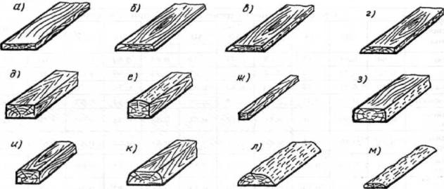в– дошка з гострим обзолом; г – дошка необрізана: д – брус чотирьохкантний;