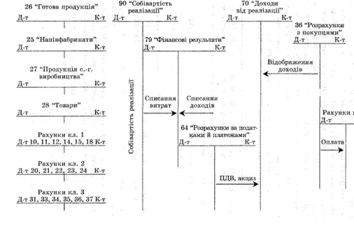 Облік процесу реалізації здійснюється за допомогою системи рахунків бухгалтерського обліку: 26 "Готова продукція", 90 "Собівартість реалізації", 70 "Доходи від реалізації", 36 "Розрахунки з покупцями і замовниками", 37 "Розрахунки з різними дебіторами", 64 "Розрахунки за податками й платежами", 79 "Фінансові результати" та ін.