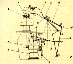 Точка вращения нижнего шарнирного рычага помещается на нижней части станины. Верхний палец нижнего шарнирного рычага примыкается к соединительному рычагу (10), верхняя шарнирная точка которого прикрепляется к двуплечевому рычагу (11). Двуплечий рычаг примыкает к наконечнику рычага-качания (9). Противоположная часть двуплечевого рычага идет к регулятору давления (14), Задача регулятора заключается в том, чтобы можно было отрегулировать давление прессования соответственно технологии; далее, в том, чтобы конструкция пресса приспособлялась к расхождениям» наступившим вследствие различной толщины обрабатываемых материалов. Установление регулятора давления производится поворачиванием ручного колеса (12).