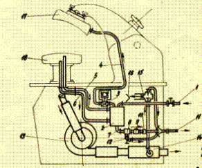 Пар из внешней паропроводной сети через клапан (1) входит в резервуар для пара (2). Из резервуара пар поступает в верхнюю подушку через электромагнитный клапан (3), который подает пар соответственно действию реле времени, встроенного в верхнюю подушку. Выходя из электромагнитного клапана, пар черев гортанную трубу (4) поступает в верхнюю подушку. Отпаривание производится через паровые отверстия, расположенные на рабочей плоскости верхней подушки.
