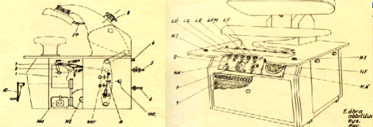 На операционном щите (2. рис. 2.5.2.), закрепленном на верхней части станины пресса, находится главный включатель (F), сигнальные лампы и телетермометр (нр), который измеряет температуру подушки и при его помощи автоматически включается и выключается электрический нагрев подушки. Степень нагретости может изменяться от 80 до 250°С и контролируется терморегулятором.